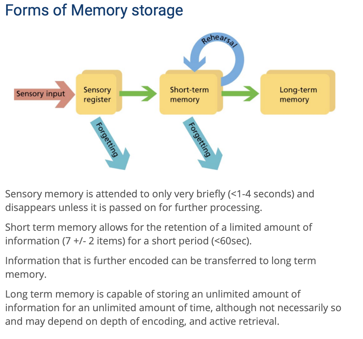Long term memory is capable of storing an unlimited amount of information for an unlimited amount of time, although not necessarily so and may depend on depth of encoding, and active retrieval.