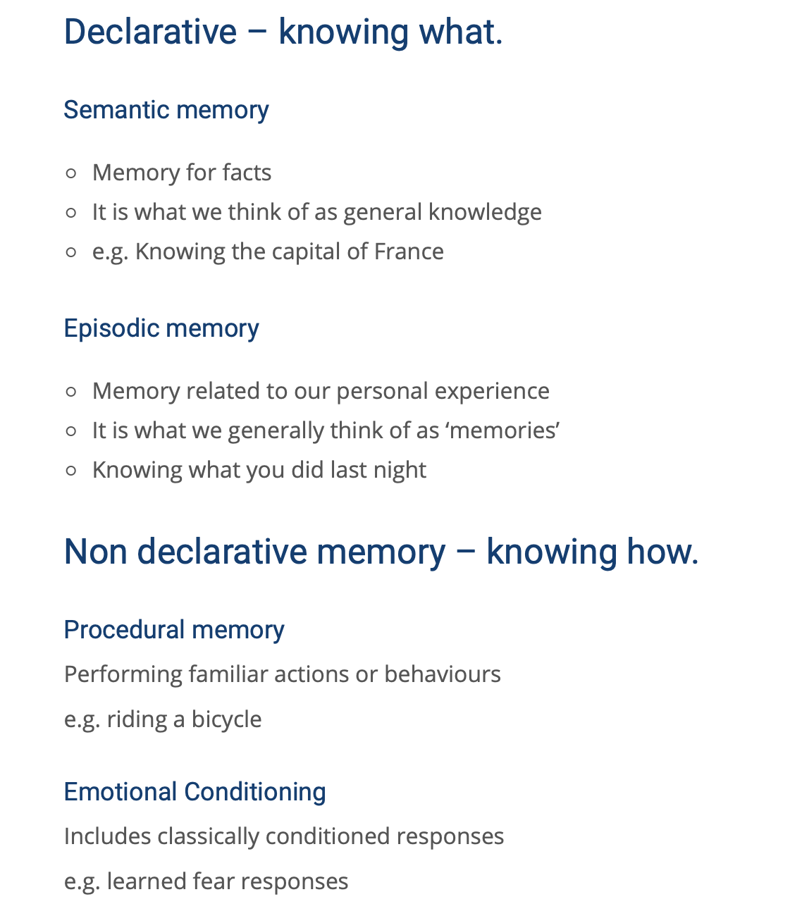 Non declarative – the actions that we don’t even think about, but we had to learn at one stage.
