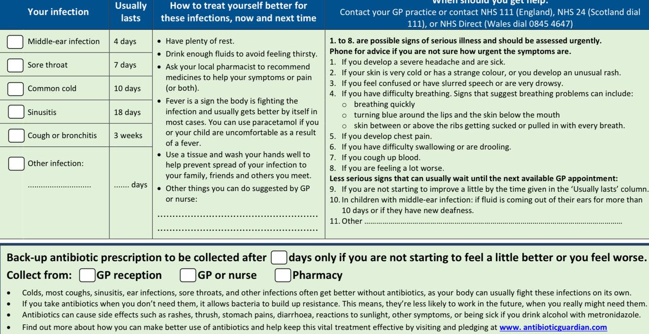 - Consider delayed antibiotic prescribing if person at risk e.g diabetic, heart failure. Same antibiotics as pneumonia