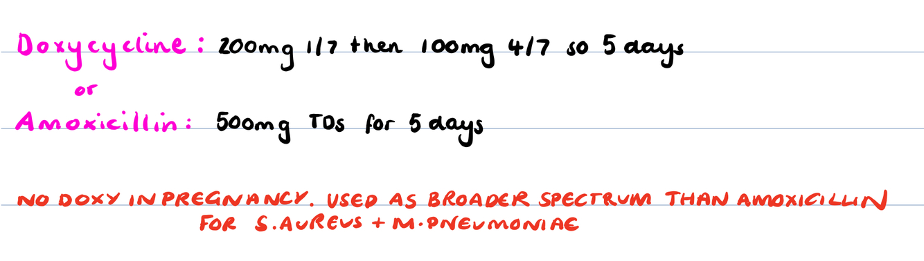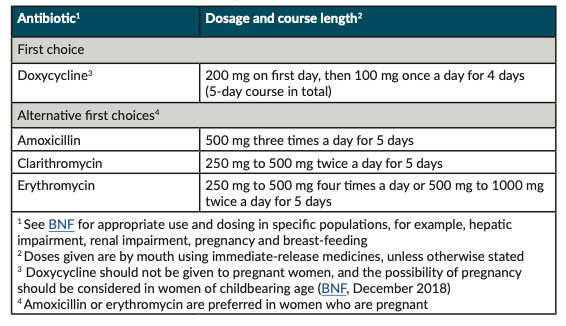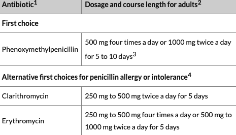 Abx of choice phenoxymethylpenicillin 500 mg 4x a day for 5 days (doxycycline/clarithromycin if penicillin allergic)