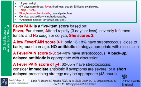 When should you prescribe antibiotics and if prescribing antibiotics for a sore throat (e.g pharnygitis or tonsillitis), what are the antibiotics of choice?