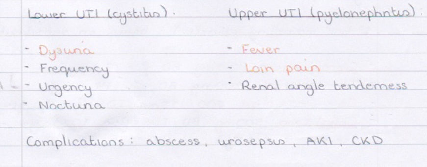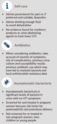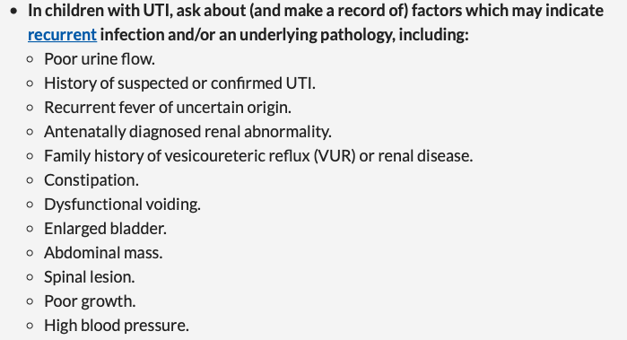 - Dipstick if >3months and if leucocyte and nitrate +ve treat as UTI