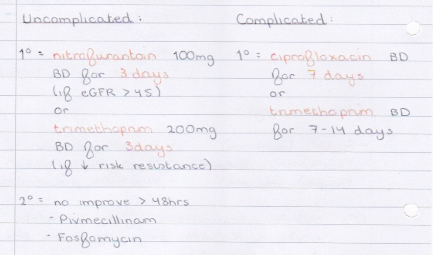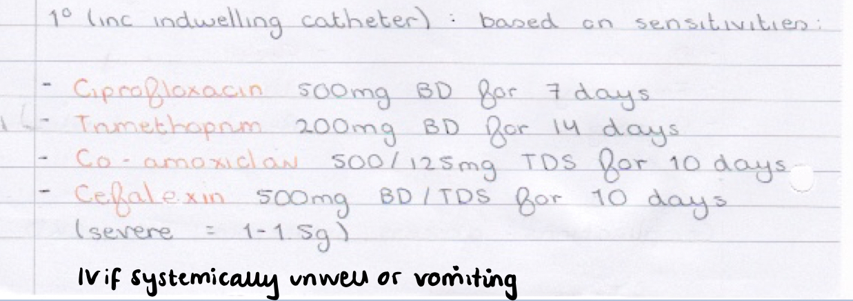 - Nitrofurantoin 100mg BD 7 days or Trimethoprim 200mg BD 7 days (only if low risk of resistance)