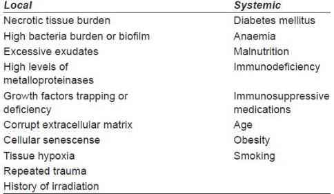 Systemic: age, stress, ischaemia, diabetes, uraemia, obesity, steroids, NSAIDs, chemotherapy, malnutrition, immunocompromised