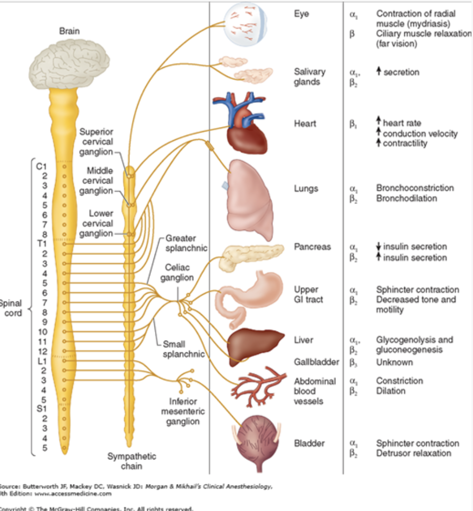 Heart –> icrease heart rate + force of contraction