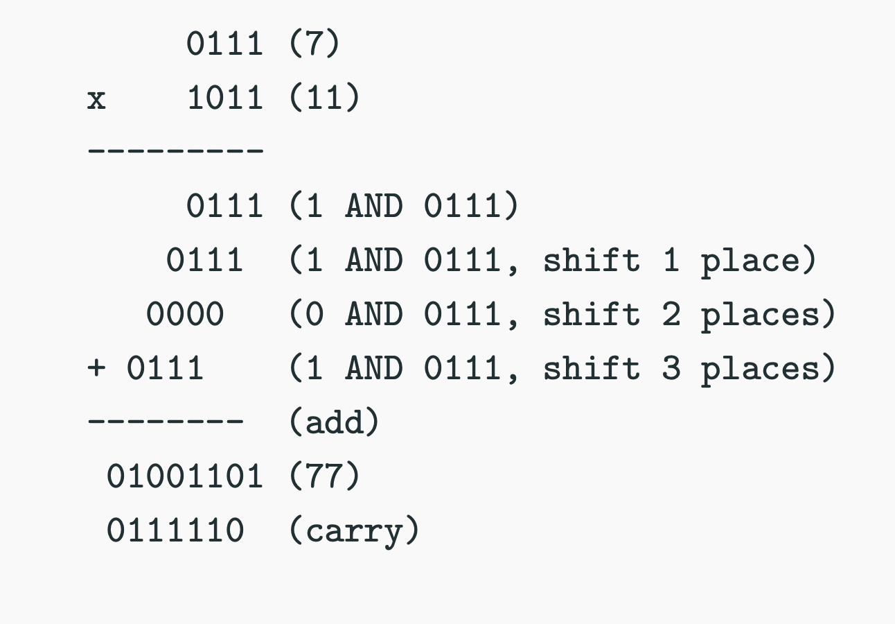 Same as denary 17 x 11 = (17 x 1 x 10^0) + (17 x 1 x 10^1)