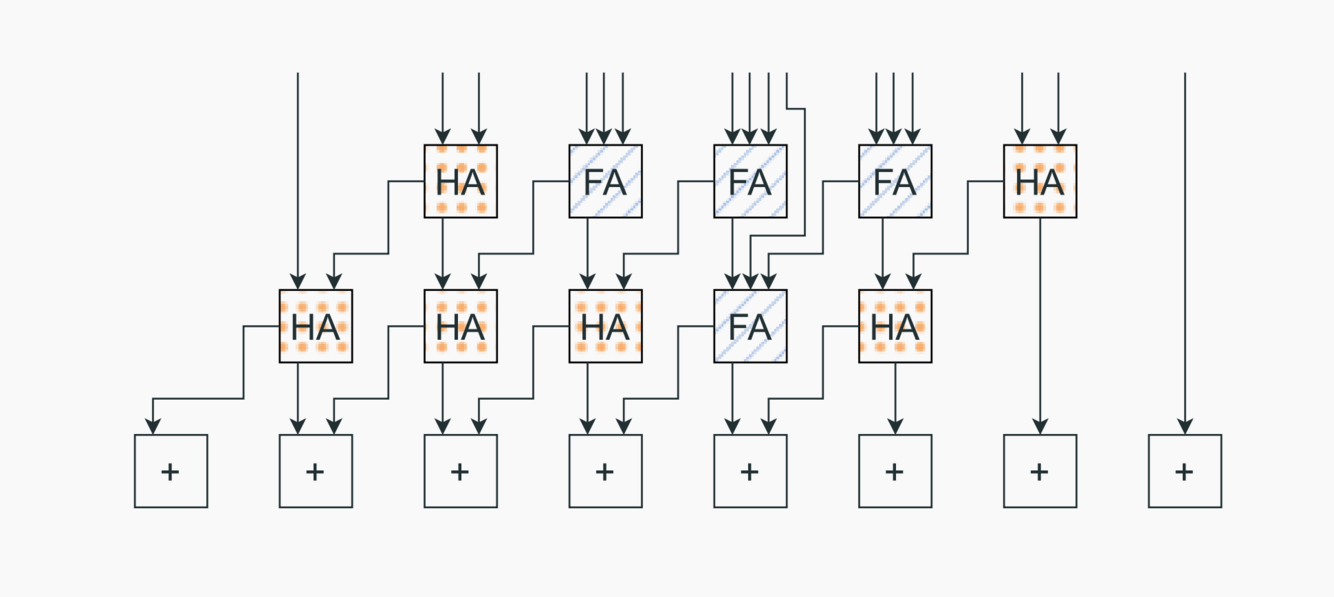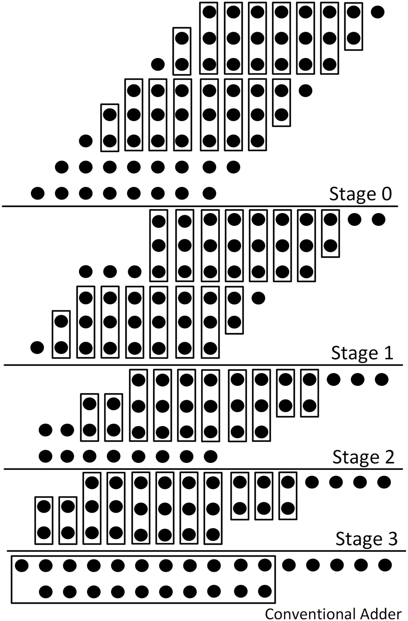 3-group = full adder, 2 group = half adder. Reduces from O(n) layers to O(log(n) layers