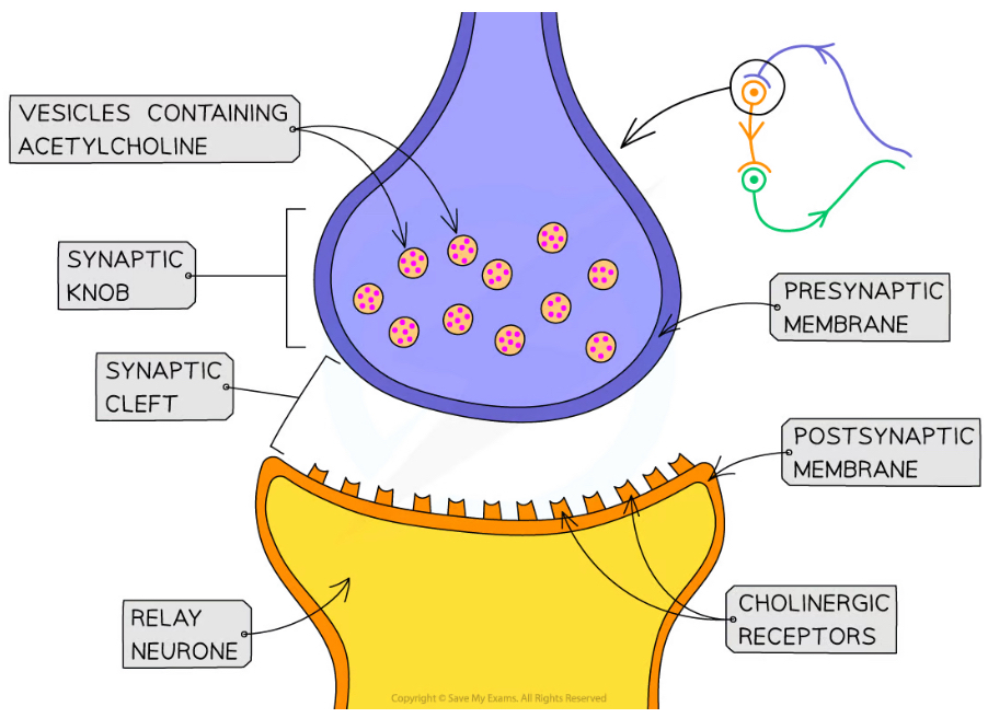 ~ Pre-synaptic neurone has a synaptic knob and vesicles contains neurotransmitters.
