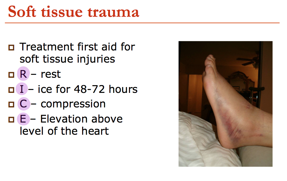 What is the pnemonic for the first aid treatment of soft tissue injuries?