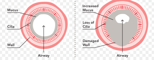 Scarring reduces the number of cilia so decreases mucus clearance and predisposes to further infection