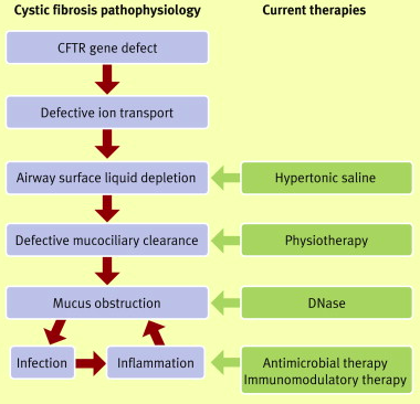 Caused by mutations to CFTR gene on chromosome 7. This encodes a chloride channel.
