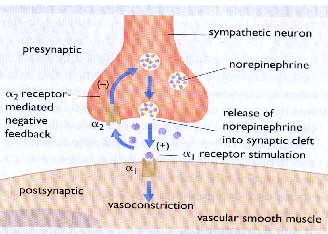 As soon as Noradrenaline is released into the synapse it binds to alpha 1+2 receptors