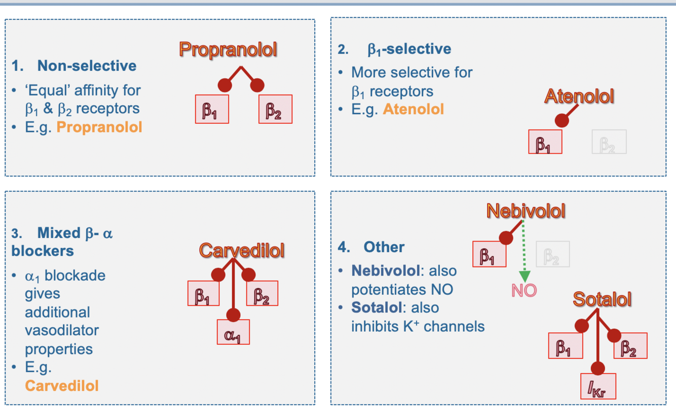 It is a non-selective ß antagonist (equal afinity for ß1+2 receptors)