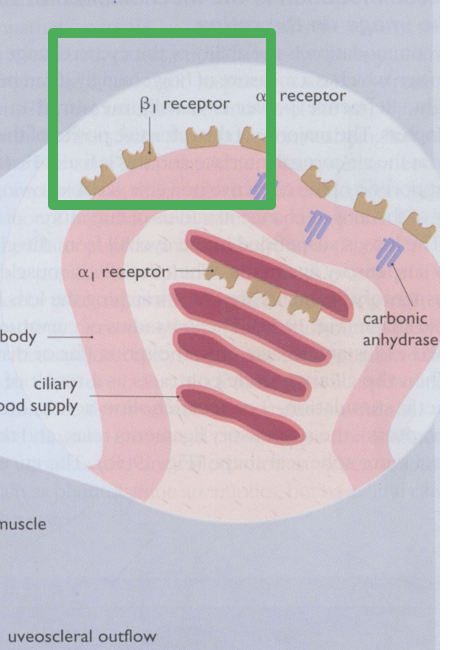 Target: ß1 receptors on cliary body –> reduction in production of aqueous humor (ß-blockers)