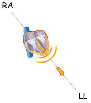 Down the ventricles and through the body fluids towards the electrodes
