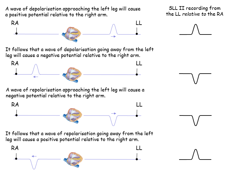 A wave of approaching depolarisation causes an upward-going blip