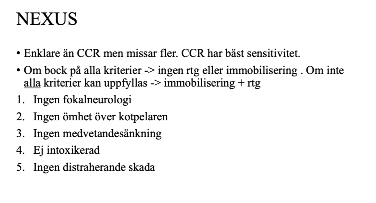 NEXUS är en algoritm för att bedöma frakturmisstanke i halsryggen på A. Vilka 5 kriterier måste uppfyllas för att inte immobilisera och röntga?