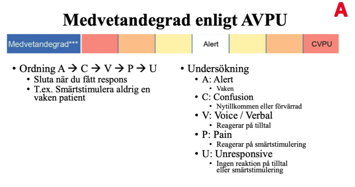 På A undersöker man medvetnadegrad med en snabb algoritm ACVPU. Vad står bokstäverna för och hur undersöker man enligt algoritmen?