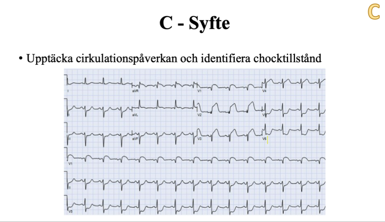 - Vad på EKG är intressant vid ABCDE att titta efter (2 saker)
