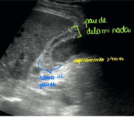 Espessamento (> 4 mm); edema de parede;