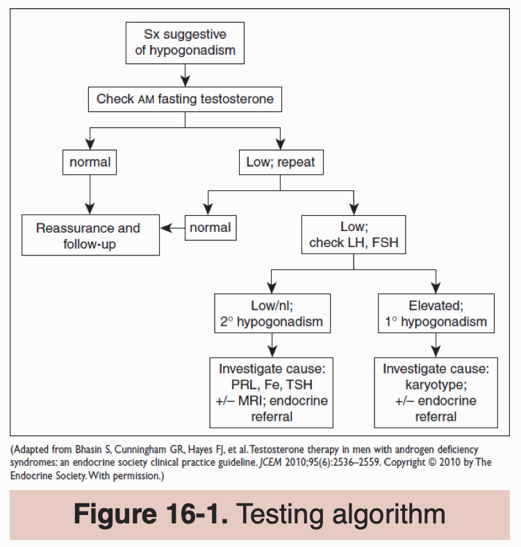 In men who are diagnosed with hypogonadism with symptoms of testosterone deficiency and unequivocally and consistently low serum testosterone concentrations, further evaluation with FSH and LH levels is advised as the initial workup to distinguish between primary and secondary hypogonadism.