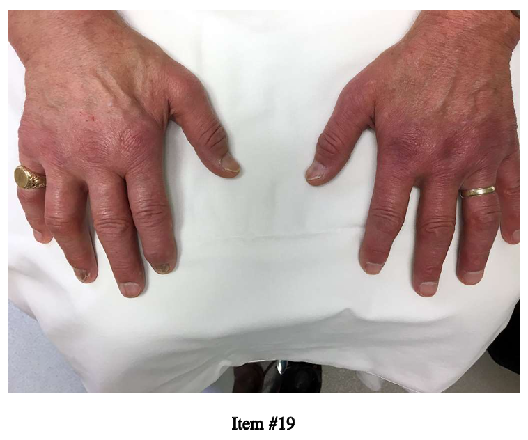 A 57-year-old male with diabetes mellitus and hypertension presents with a 1-month history of pain in his hands and elbows. His hands are shown below. On examination they are tender and he has soft swelling of the wrists, metacarpophalangeal (MCP) joints, and proximal interphalangeal (PIP) joints. Plain films show mild, diffuse bony erosions in the MCP and PIP joints.
