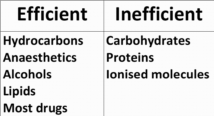 Which molecules are effieicnet/ineffieicent in passive diffusion?