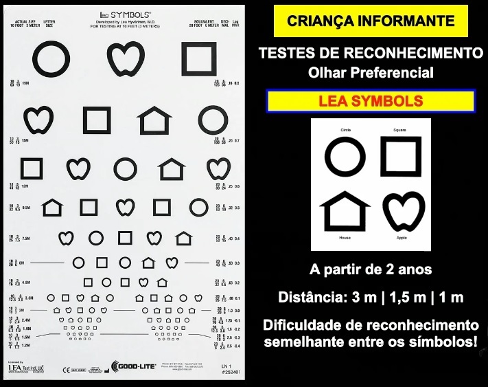 Utiliza 4 optotipos: Círculo, quadrado, maçã, casa