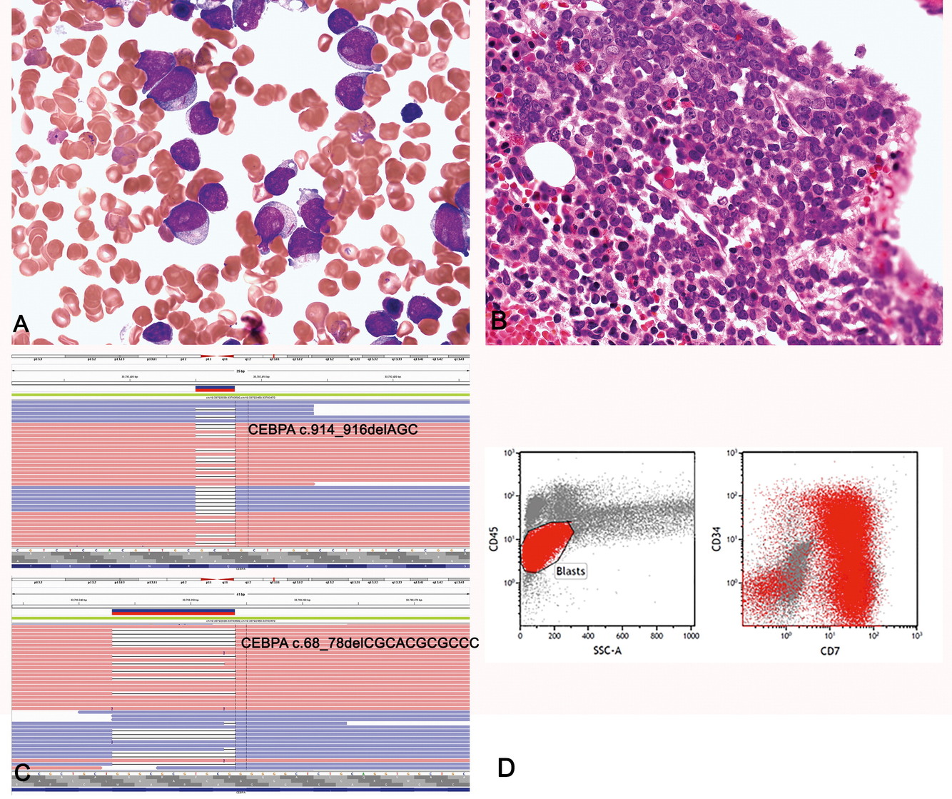 Flow cytometric analysis reveals blasts with aberrant CD7 expression.