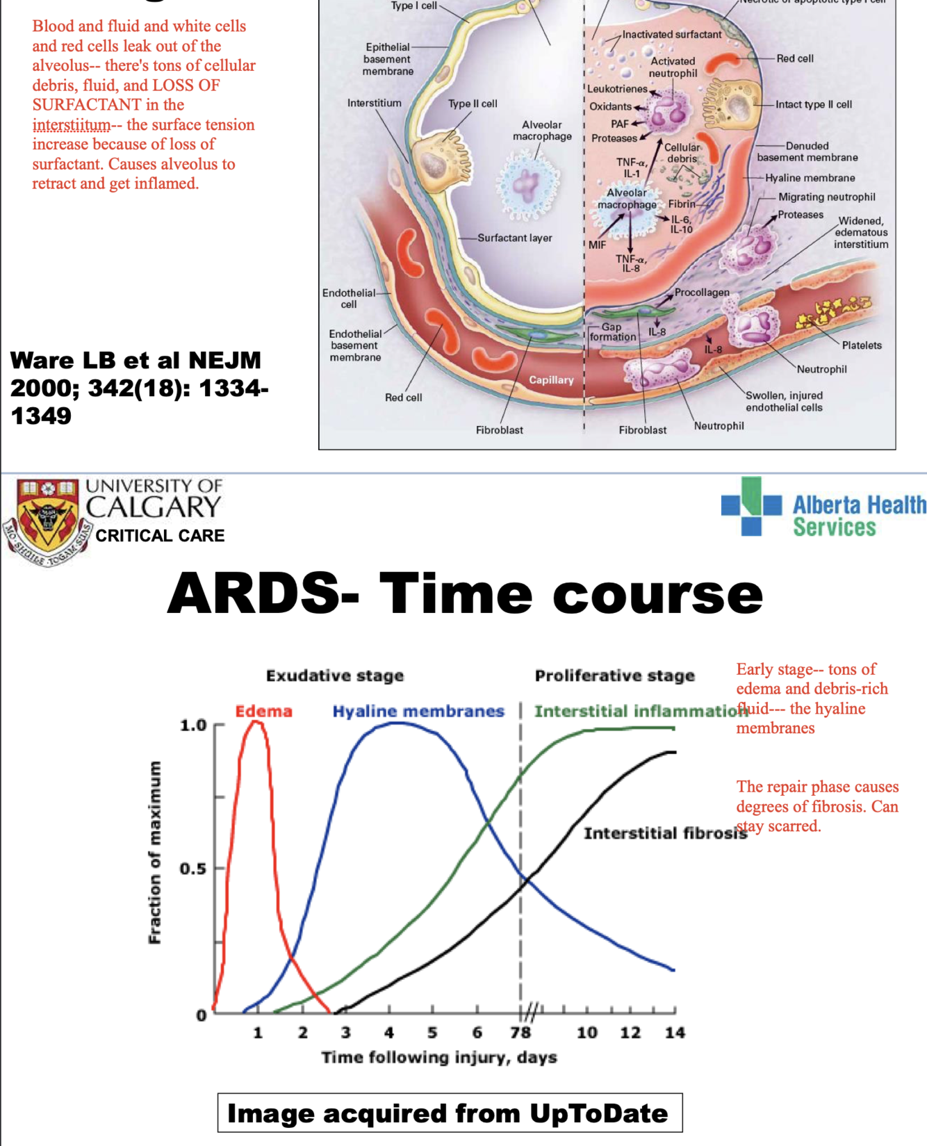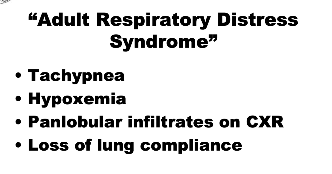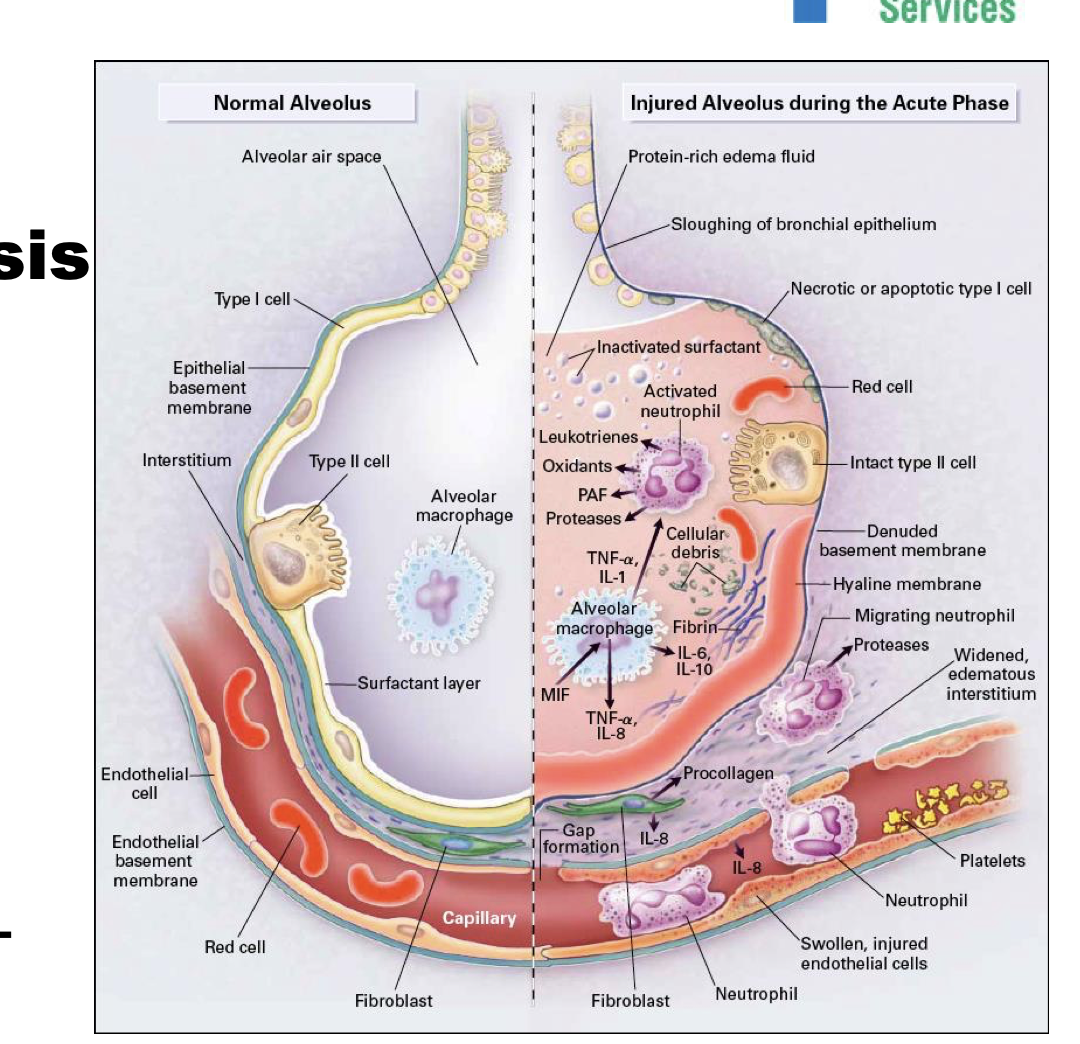 Blood and fluid and white cells and red cells leak out of the alveolus– there’s tons of cellular debris, fluid, and LOSS OF SURFACTANT in the interstiitum– the surface tension increase because of loss of surfactant. Causes alveolus to retract and get inflamed.