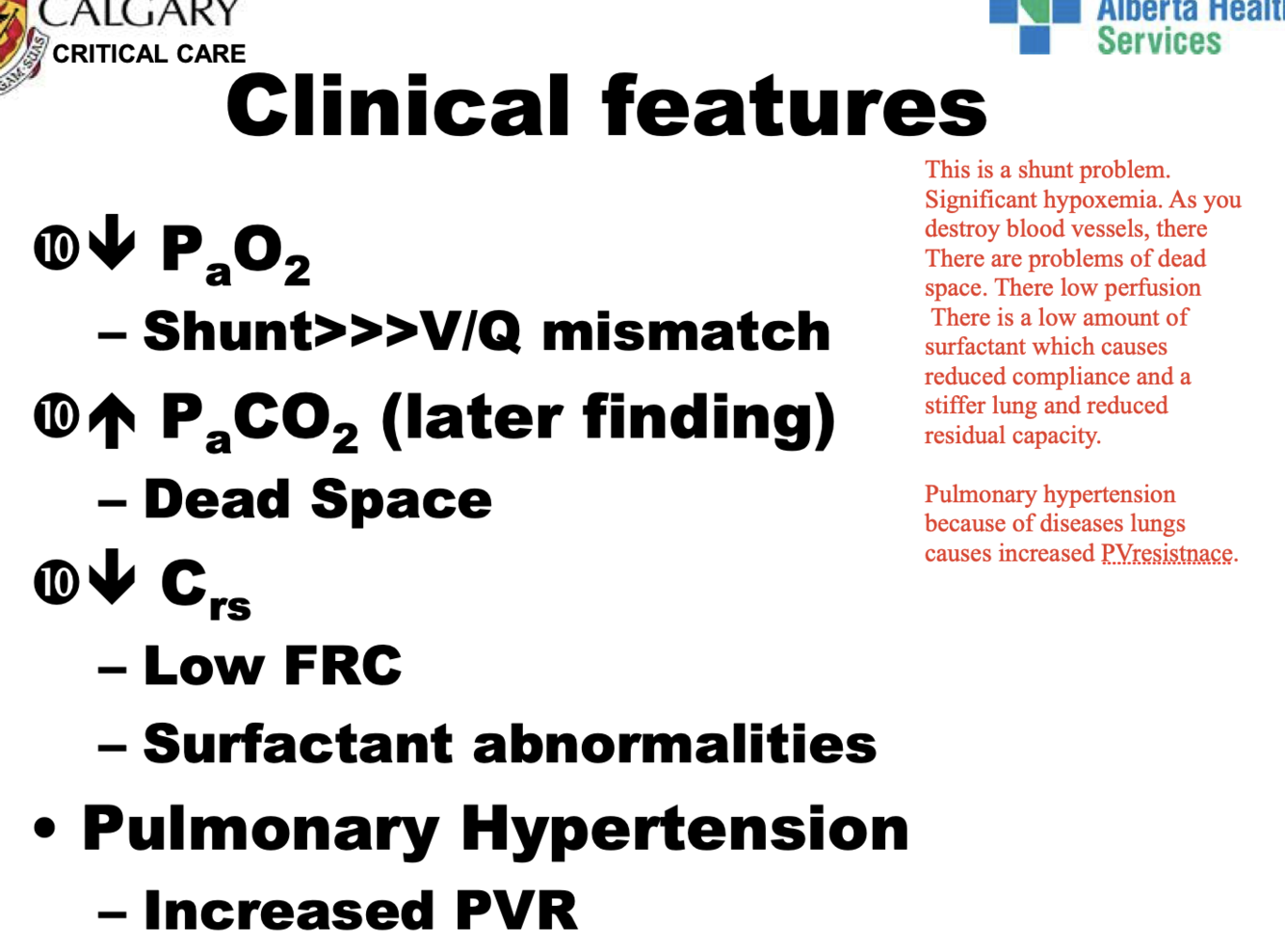 there is low perfusion and there is a low amount of SURFACTANT which causes reduced compliance and a stiffer lung and reduced residual capacity.