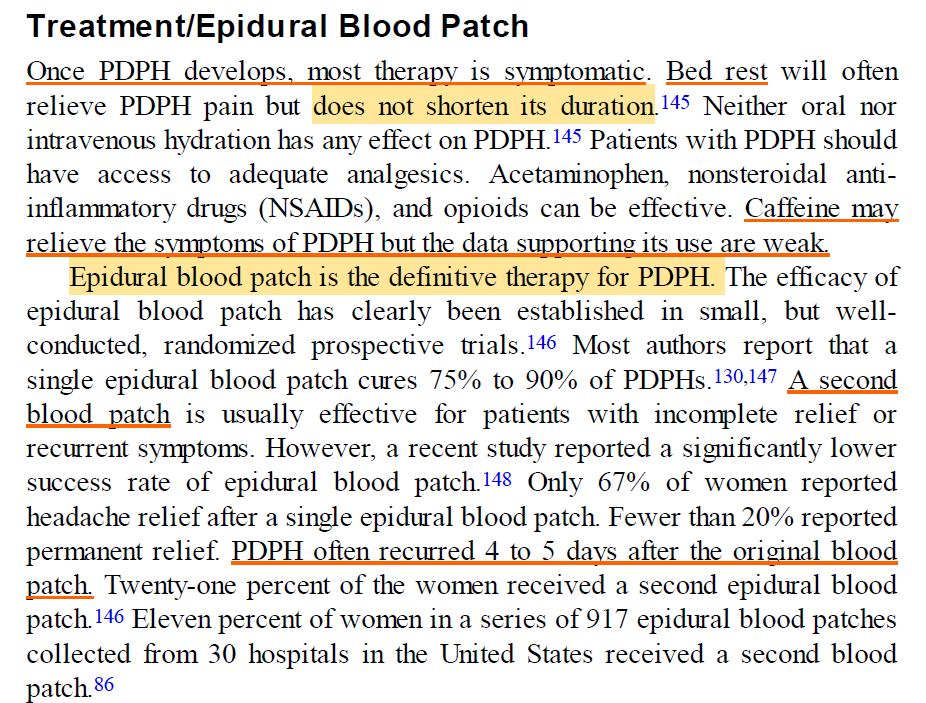 A second blood patch is usually effective for patients with incomplete relief or recurrent symptoms. However, a recent study reported a significantly lower