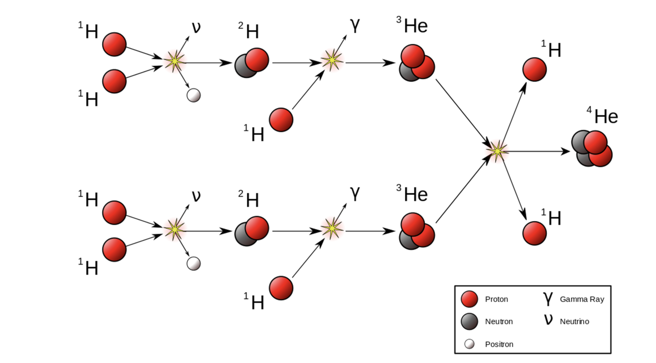 4 (1H) → 4He + 2e+ + 2 neutrinos + energy