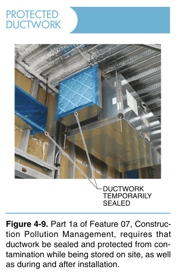 What are the strategies of Part 1 (Duct Protection) of Feature 7 (Construction Pollution Management)?