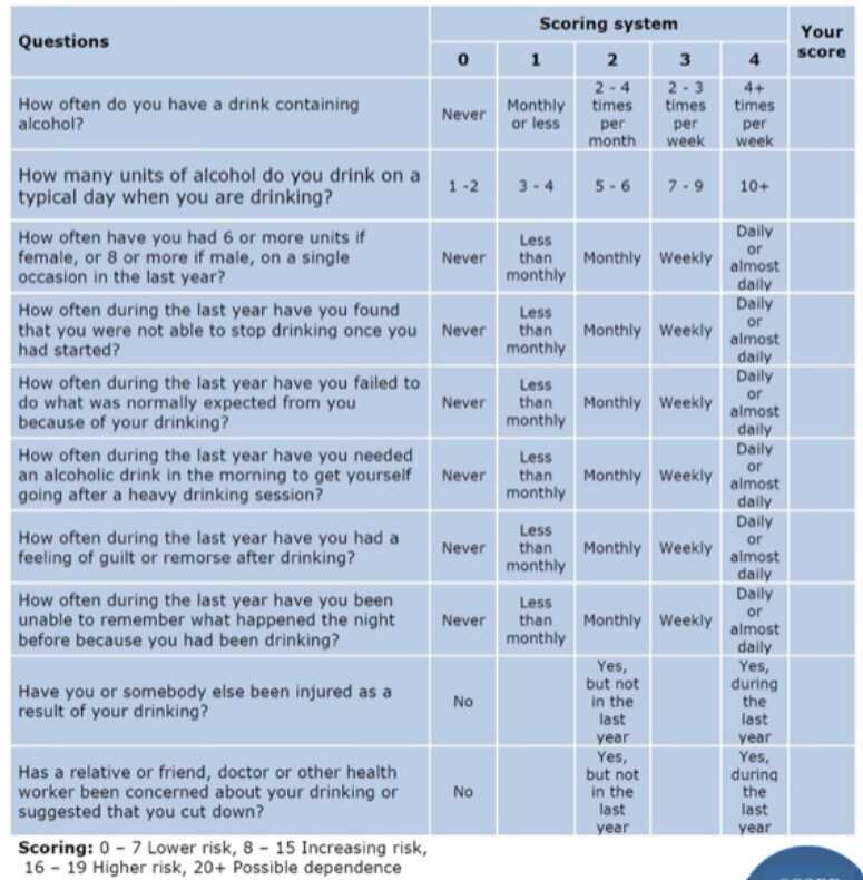 CAGE or SAD-Q (severity of alcohol dependence questionnaire)