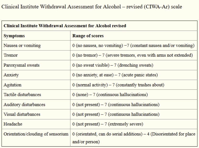 CIWA-Ar assessment - use this to guide treatment. Benzodiazepines usually used if scoring _>_10.