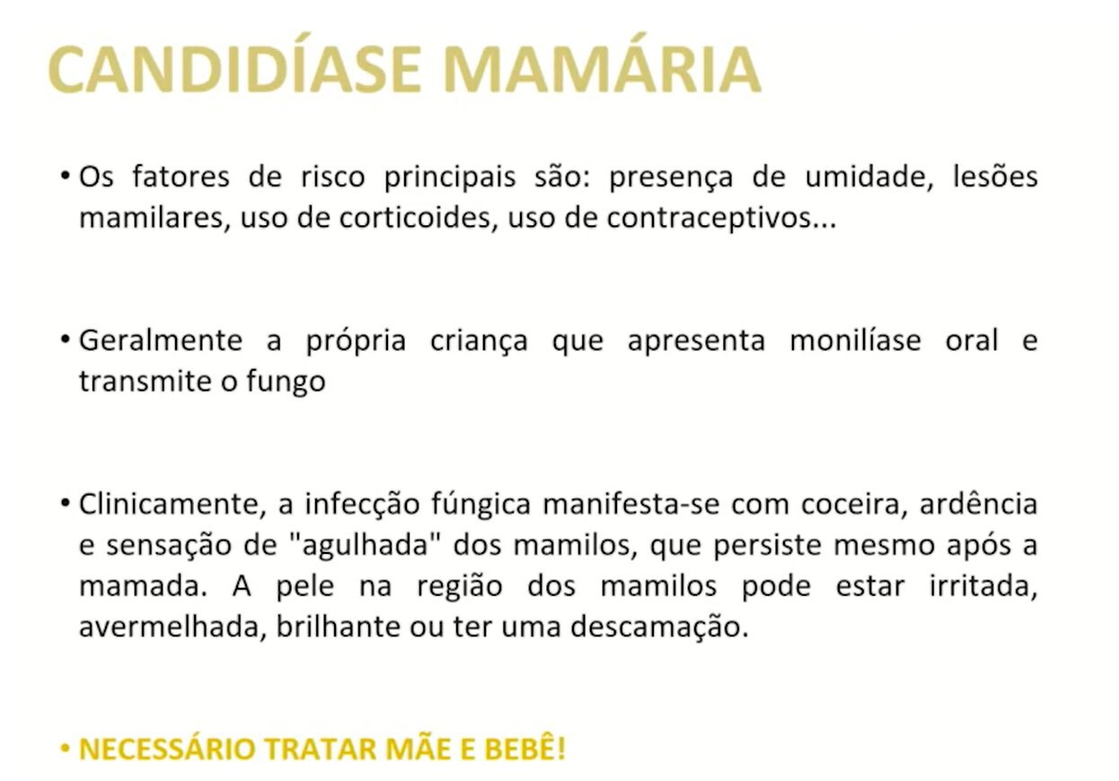Por esse motivo em quadro de candidíase mamária na mãe devemos tratar tanto ela quanto o bebê.