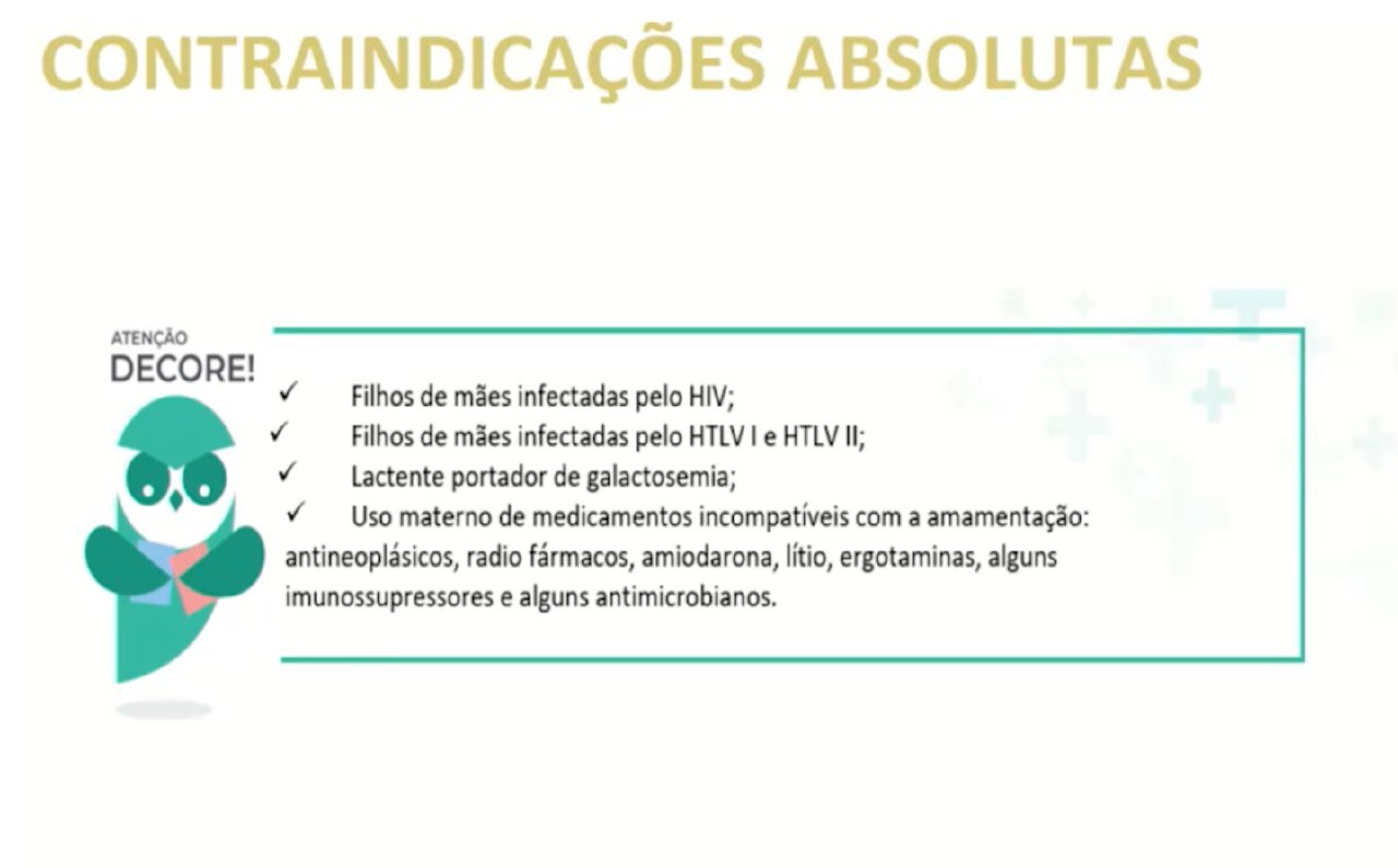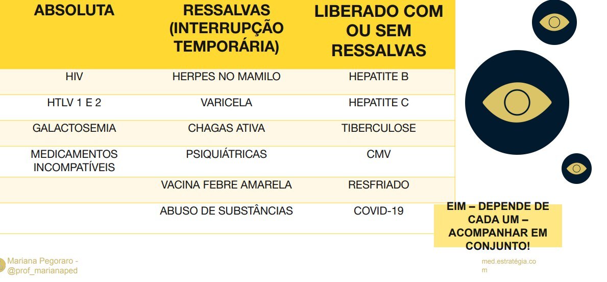 🔹 Varicela, se a mãe ter lesão por varicela cinco dias antes à dois dias depois do parto é uma contraindicação temporária da amamentação, pois essa gestante não vai poder ter contato íntimo com esse bebê até que suas lesões sejam virado crostas. Só que esse leite pode ser retirado da mama para ser oferecida ao recém-nascido por outra pessoa. E lembrando que esse recém-nascido vai ter que receber imunoglobulina para varicela até 96 horas após o parto.