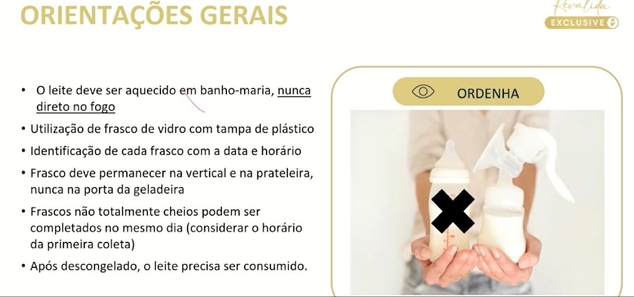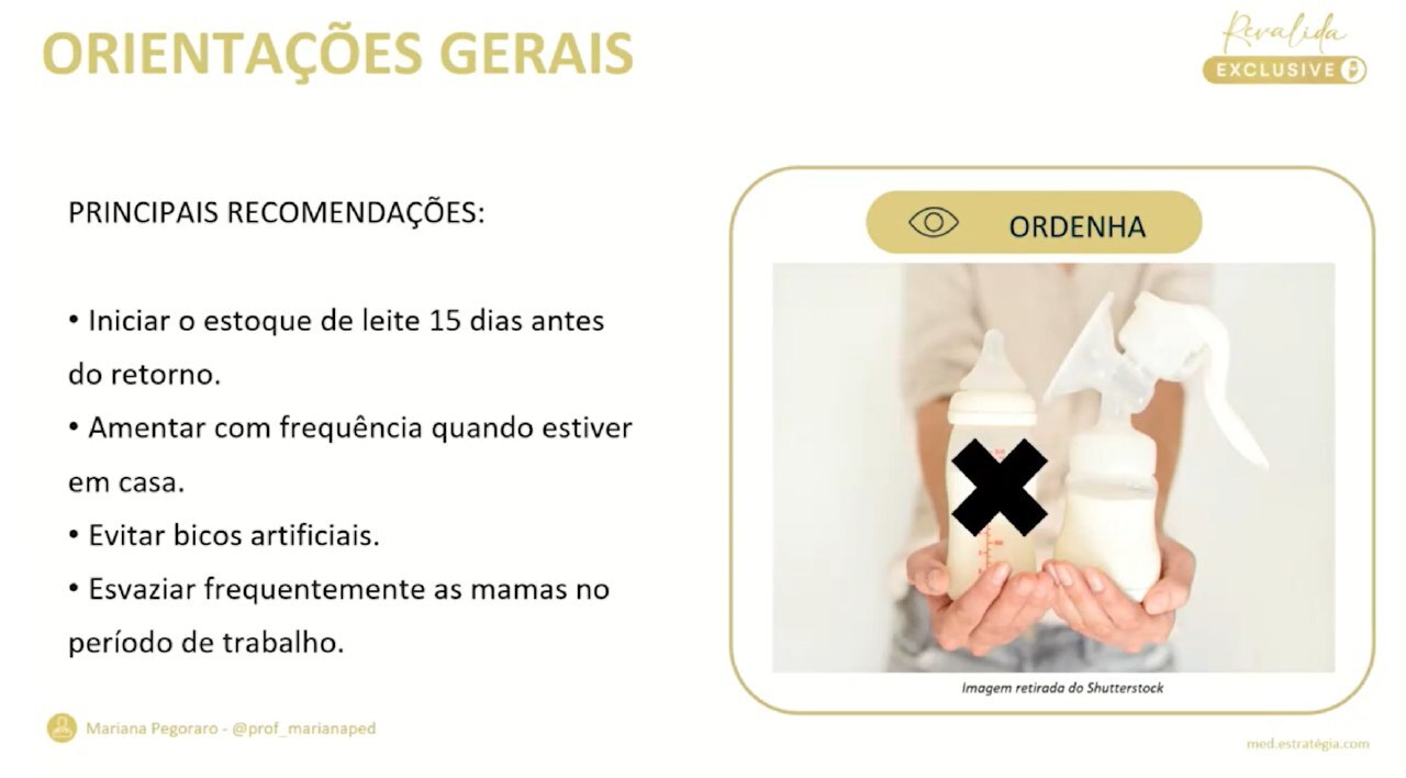 🔹Se o recém-nascido tiver menor que 6 meses de idade essa gestante tem que ordenhar e iniciar o estoque de leite 15 dias antes do retorno ao trabalho. LEMBRAR QUE A GESTANTE SEMPRE VAI TER QUE ORDENHAR O LEITE MESMO NA VIGÊNCIA DE ALIMENTAÇÃO COMPLEMENTAR, POIS O RECÉM-NASCIDO DEVE RECEBER LEITE MATERNO ATÉ OS DOIS ANOS DE IDADE.