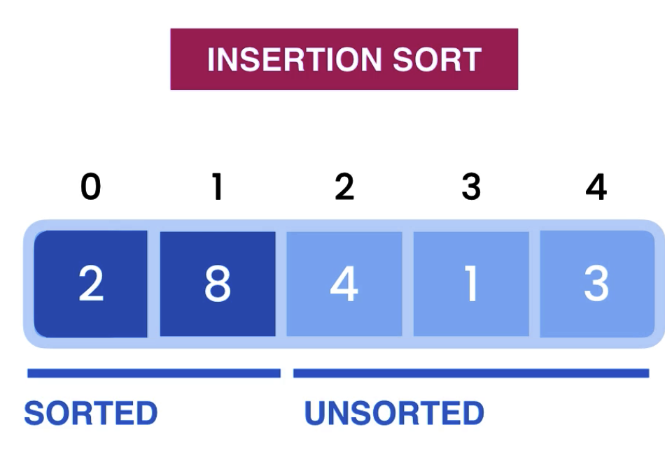 each iteration pick one value from unsorted part, insert into sorted part (shift, make space)
