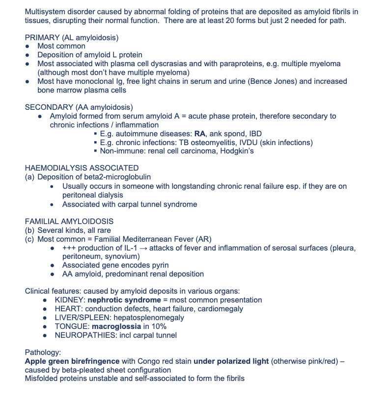 Discuss the aetiology and clinical features of the different types of amyloidosis. Discuss the result of a congo red stain for amyloidosis. Discuss the diseases that occur as a result of amyloid build up.(npr)(222)