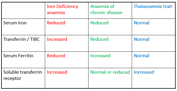 Differentiate between IDA, anaemia of chronic disease and thalassaemia in terms of expected results on iron studies parameters