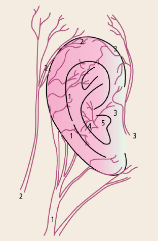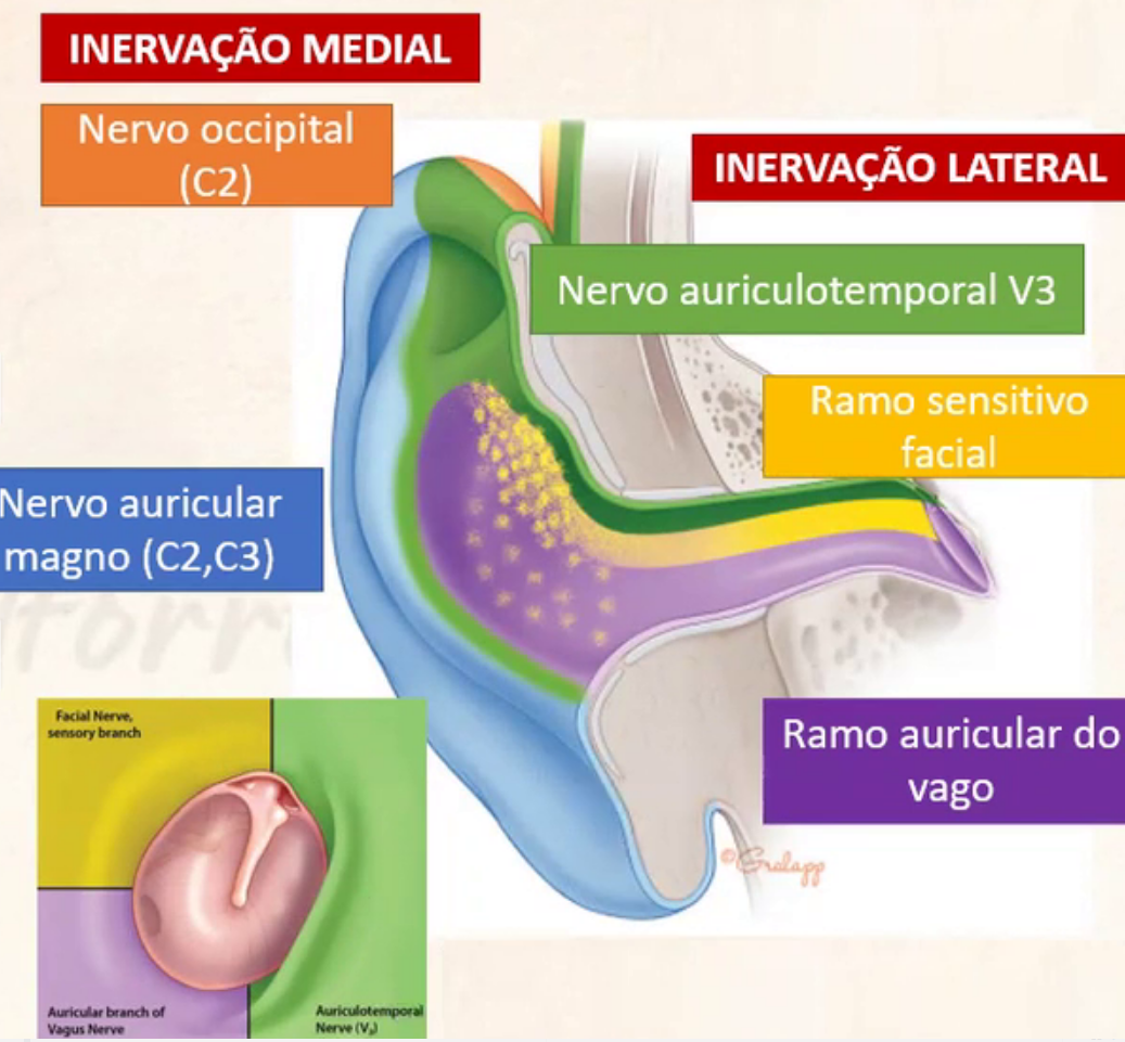 Cite a inervação da orelha externa medial e lateral (citando os números abaixo) e do conduto auditivo externo (paredes anterior, posteroinferior e posterossuperior).