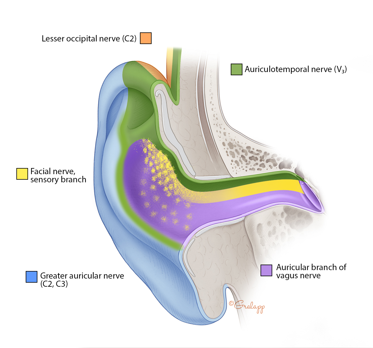 Região posterossuperior (amarela) inervada pelo ramo intermedio (parte sensitiva), proveniente do nervo facial.