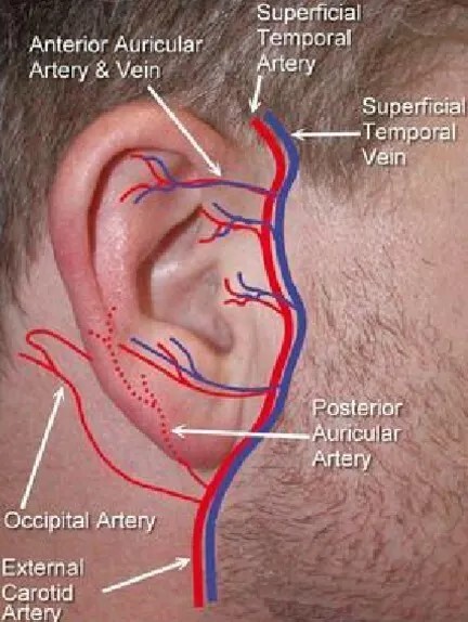 Todas as artérias acima se originam da CARÓTIDA EXTERNA. A drenagem venosa ocorre pela JUGULAR EXTERNA e a drenagem linfática para as cadeias PAROTÍDEA, CERVICAL e MASTOIDEA.