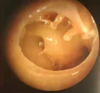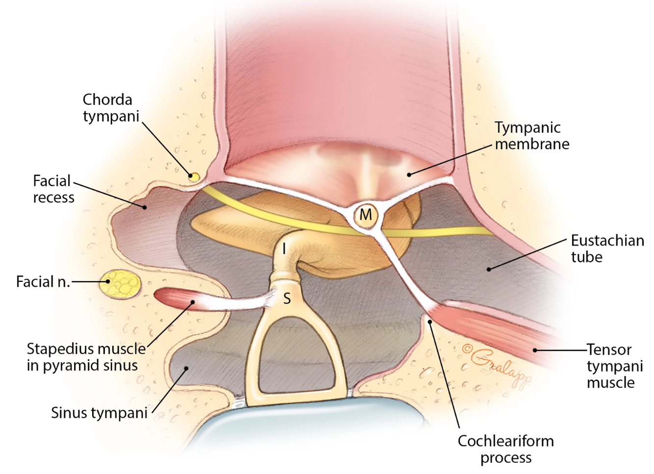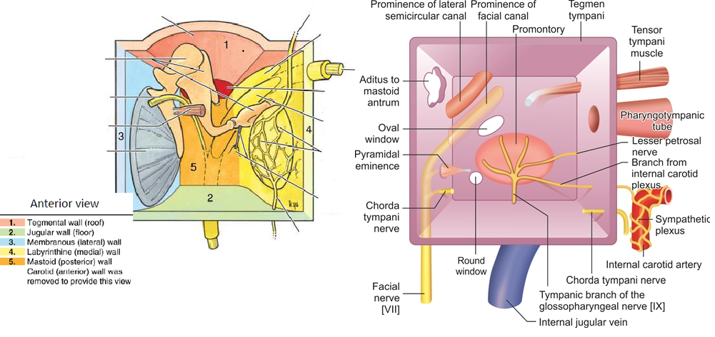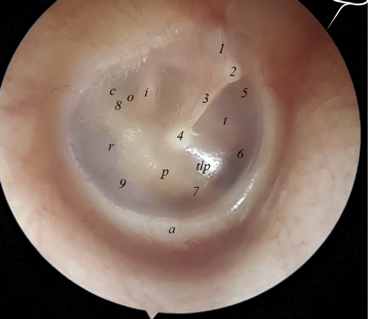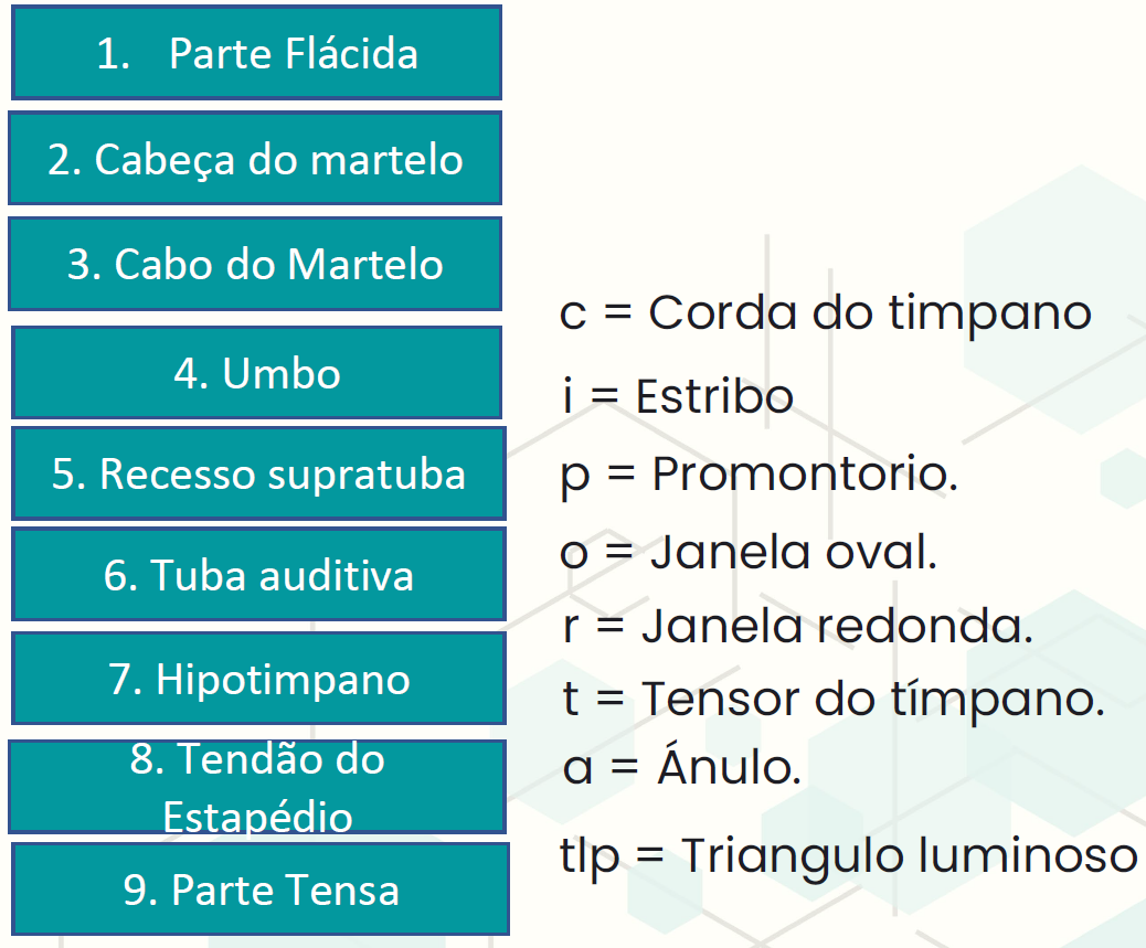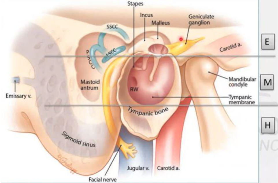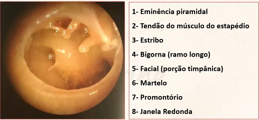 Baseado na imagem abaixo, cite as 3 divisões da caixa timpânica e quais estruturas pertencem a cada um desses andares.