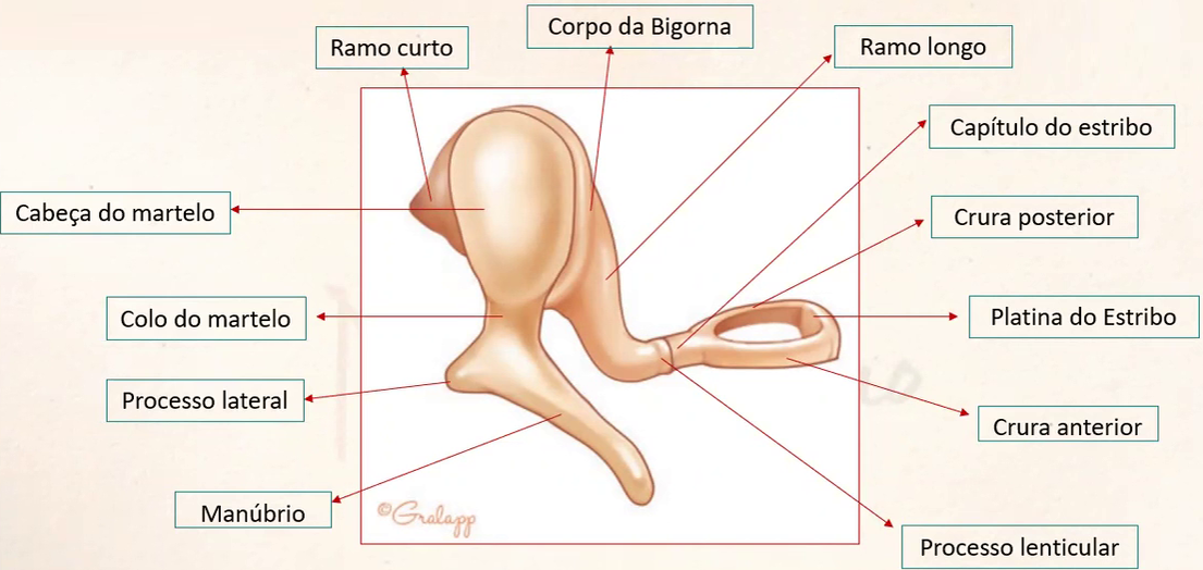 Descreva todos os componentes da cadeia ossicular (12 no total) abaixo.