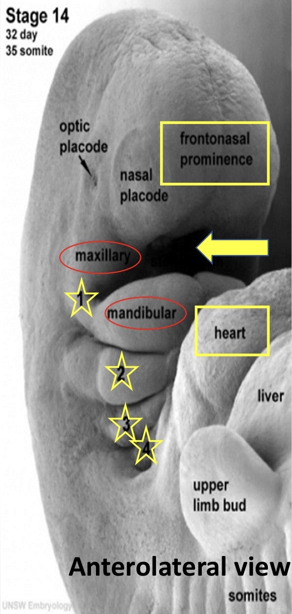 1st arch divides into 2 prominences on both sides of stomodeum. (maxillary & mandibular)
