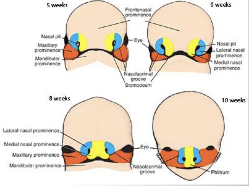 1. The frontonasal process: a median prominence, cranially (It arises from head fold).