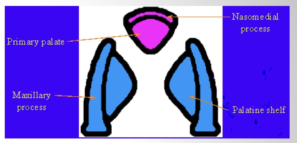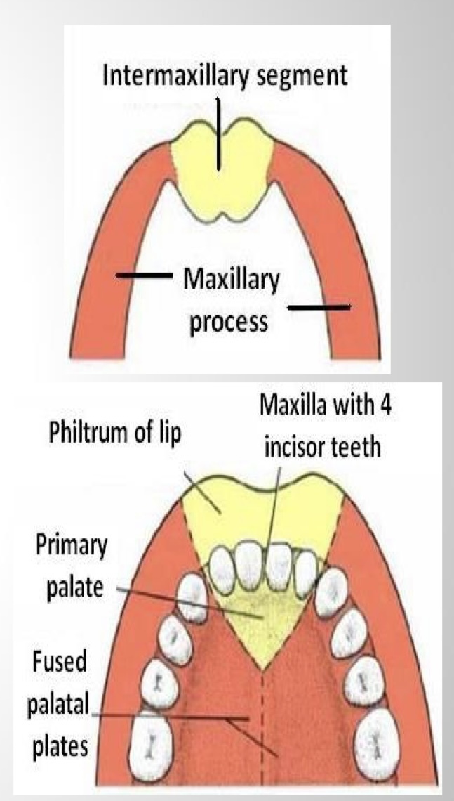 The primary palate is represented by the anterior triangular part of the hard palate.